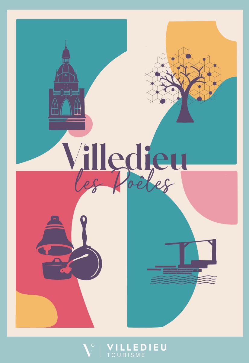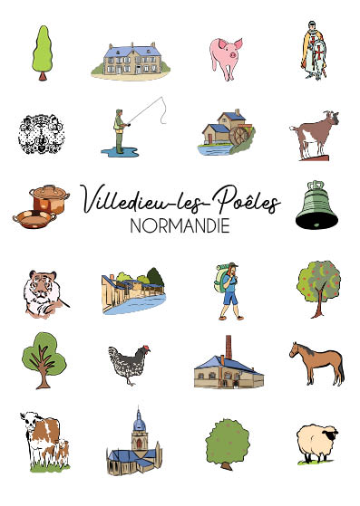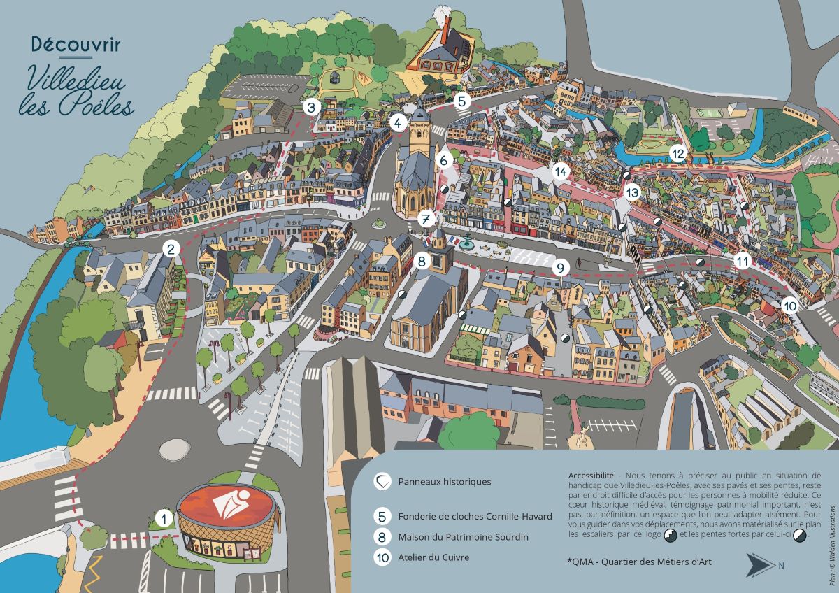 Réalisation d’un plan de ville en 3D, précis et immersif, illustré et mis en page pour accompagner les visiteurs dans la découverte de Villedieu-les-Poêles et de son parcours historique.